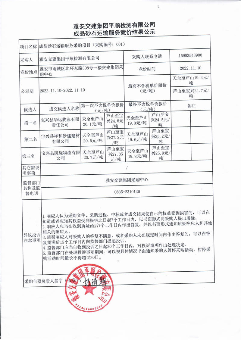 雅安交建集團(tuán)平順檢測(cè)有限公司成品砂石運(yùn)輸服務(wù)競(jìng)價(jià)結(jié)果公示