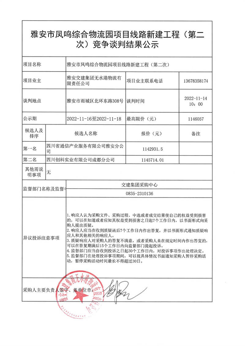 雅安交建集團(tuán)無水港物流有限責(zé)任公司雅安市鳳鳴綜合物流園項(xiàng)目線路新建工程(第二次)競(jìng)爭(zhēng)談判結(jié)果公示