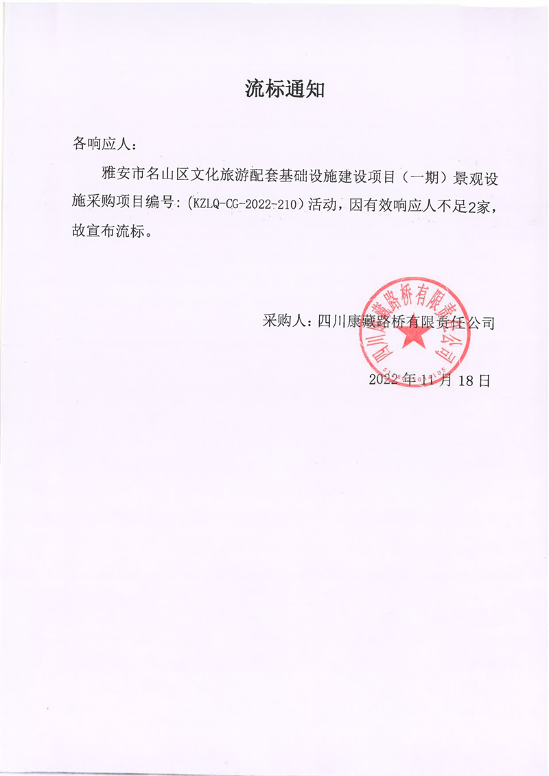 四川康藏路橋有限責(zé)任公司雅安市名山區(qū)文化旅游配套基礎(chǔ)設(shè)施建設(shè)項(xiàng)目(一期)景觀設(shè)施采購項(xiàng)目流標(biāo)通知