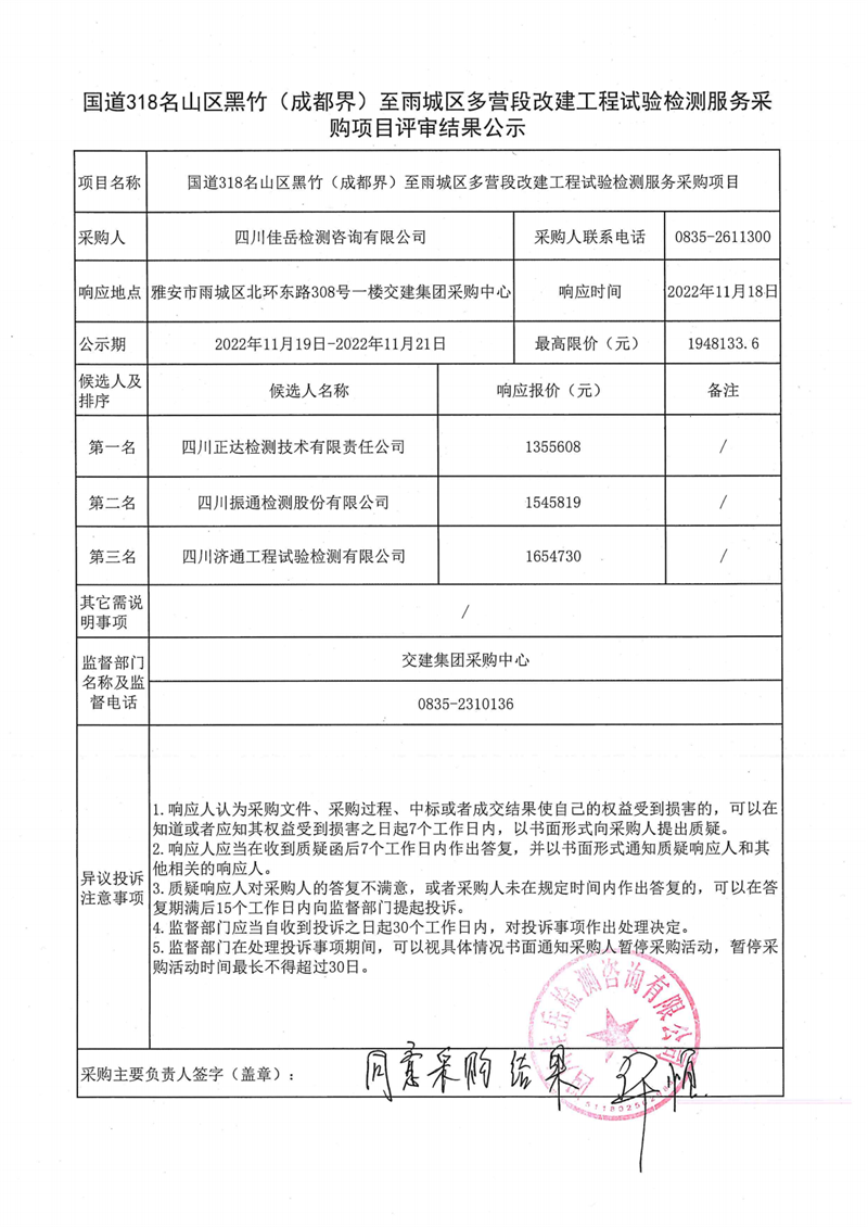 四川佳岳檢測(cè)咨詢(xún)有限公司國(guó)道318名山區(qū)黑竹(成都界)至雨城區(qū)多營(yíng)段改建工程試驗(yàn)檢測(cè)服務(wù)采購(gòu)項(xiàng)目評(píng)審結(jié)果公示