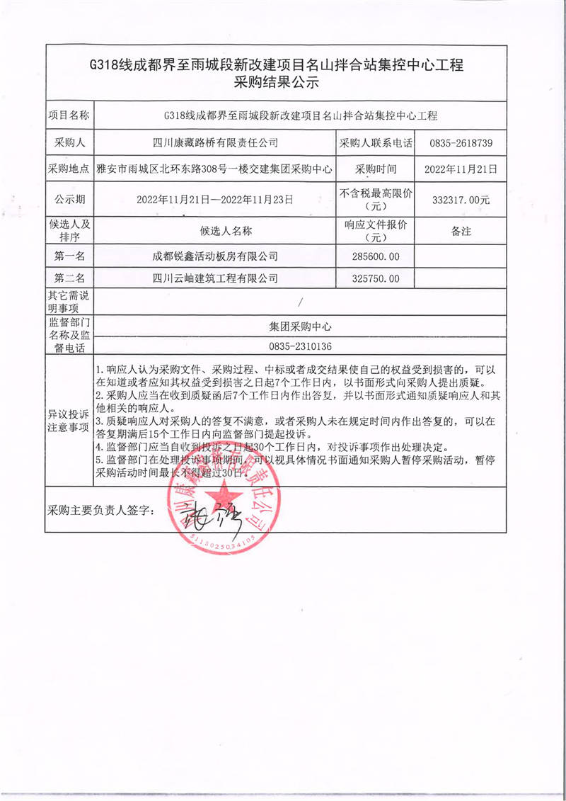 四川康藏路橋有限責(zé)任公司G318線成都界至雨城段新改建項目名山拌合站集控中心工程采購結(jié)果公示