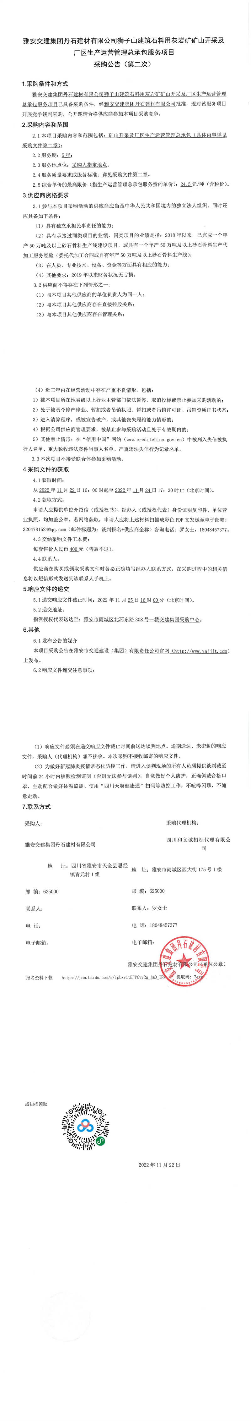 雅安交建集團(tuán)丹石建材有限公司獅子山建筑石料用灰?guī)r礦礦山開采及廠區(qū)生產(chǎn)運(yùn)營管理總承包服務(wù)項目采購公告(第二次)