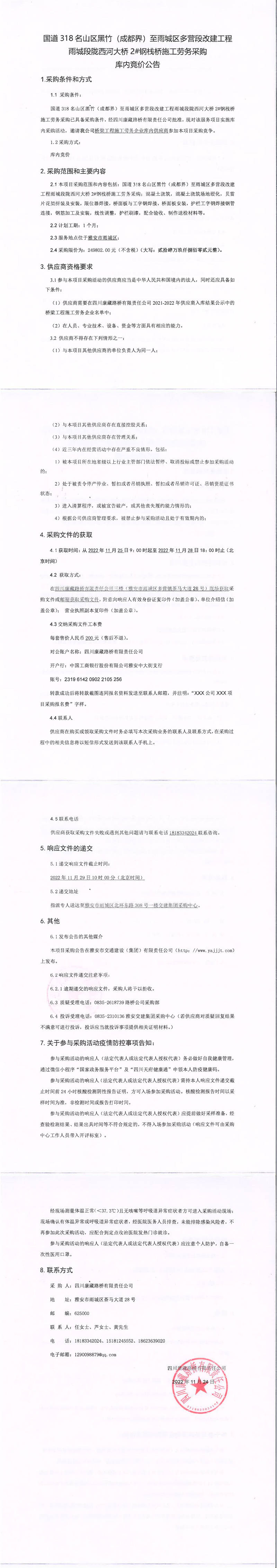 四川康藏路橋有限責(zé)任公司國道318名山區(qū)黑竹(成都界)至雨城區(qū)多營段改建工程雨城段隴西河大橋2#鋼棧橋施工勞務(wù)采購庫內(nèi)競價(jià)公告