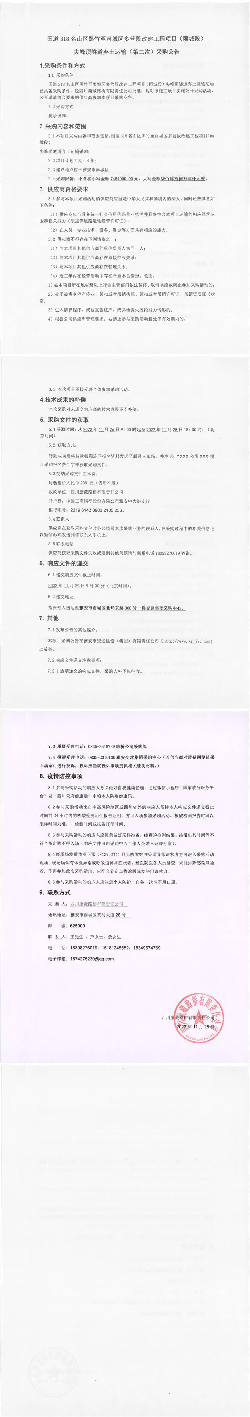 四川康藏路橋有限責(zé)任公司國道318名山區(qū)黑竹至雨城區(qū)多營段改建工程項(xiàng)目(雨城段)尖峰頂隧道棄土運(yùn)輸(第二次)采購公告