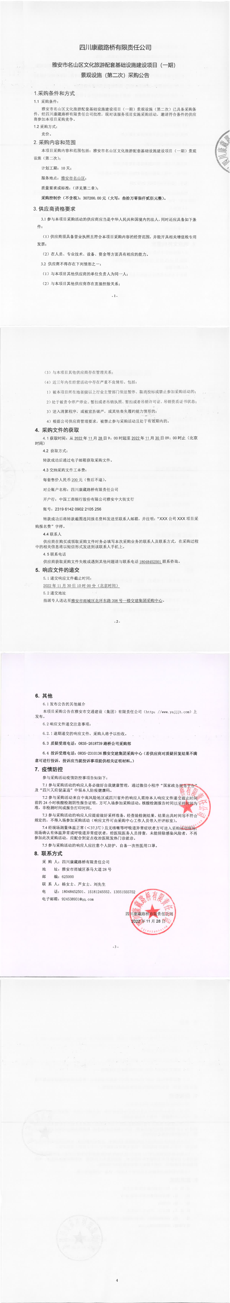 四川康藏路橋有限責任公司雅安市名山區(qū)文化旅游配套基礎設施建設項目(一期)景觀設施(第二次)采購公告