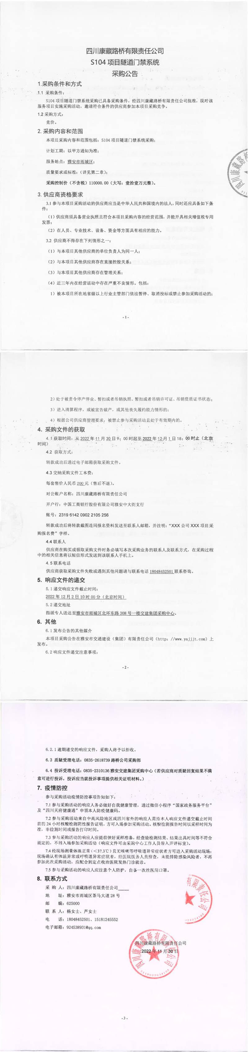 四川康藏路橋有限責(zé)任公司S104項(xiàng)目隧道門禁系統(tǒng)采購(gòu)公告