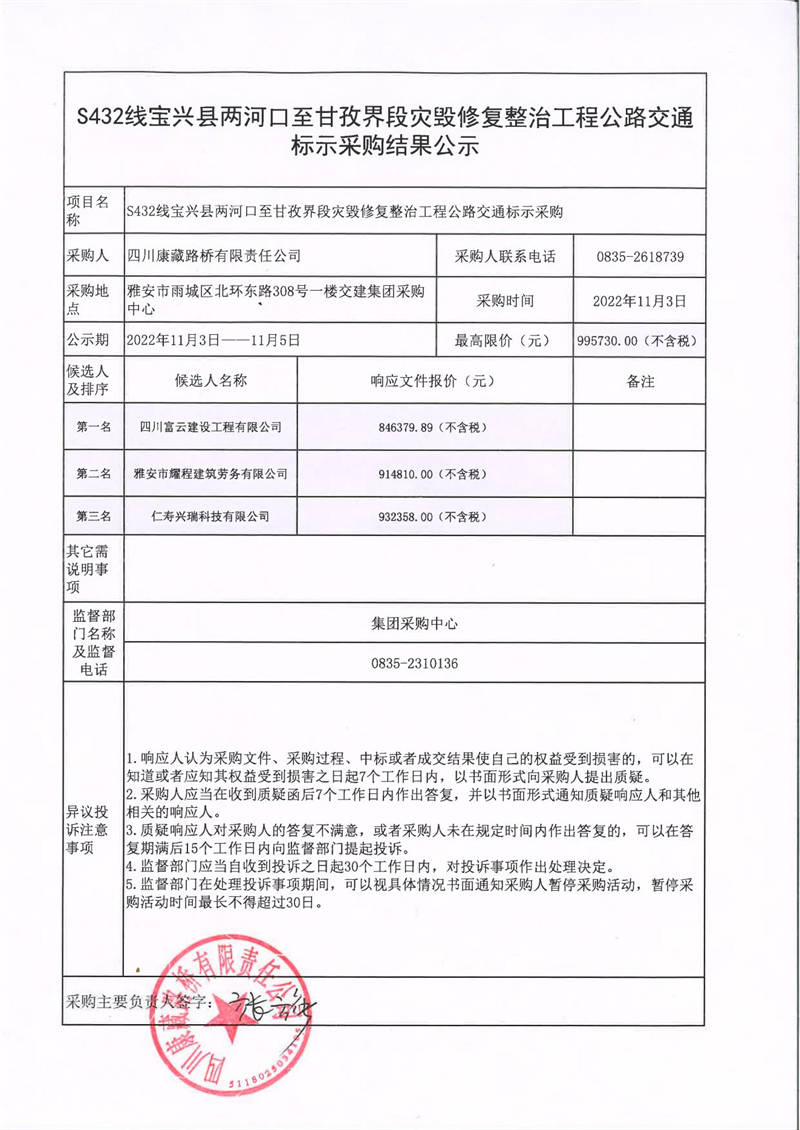 四川康藏路橋有限責(zé)任公司S432線寶興縣兩河口至甘孜界段災(zāi)毀修復(fù)整治工程公路交通標(biāo)示采購結(jié)果公示