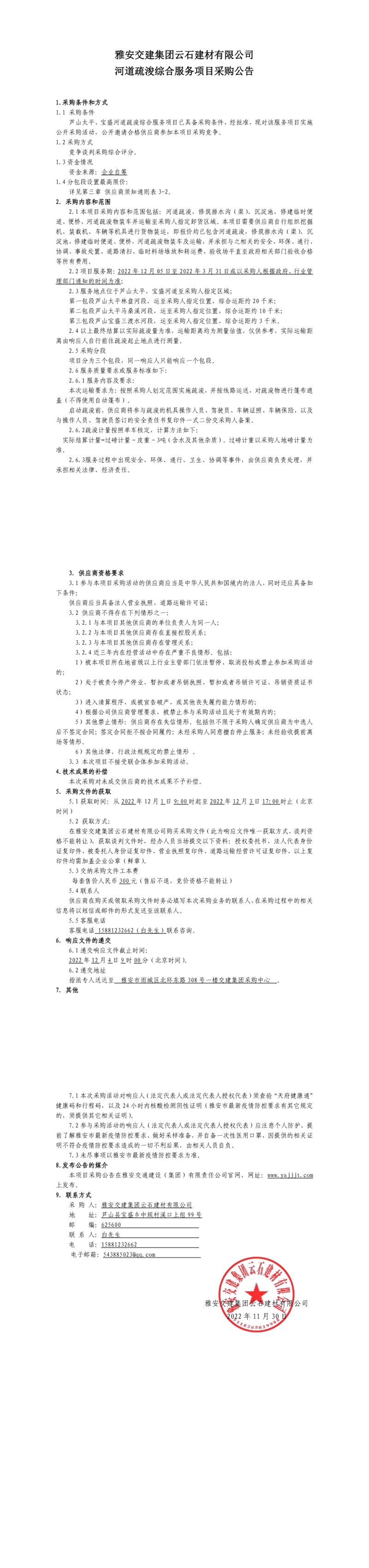 雅安交建集團(tuán)云石建材有限公司河道疏浚綜合服務(wù)項(xiàng)目采購(gòu)公告