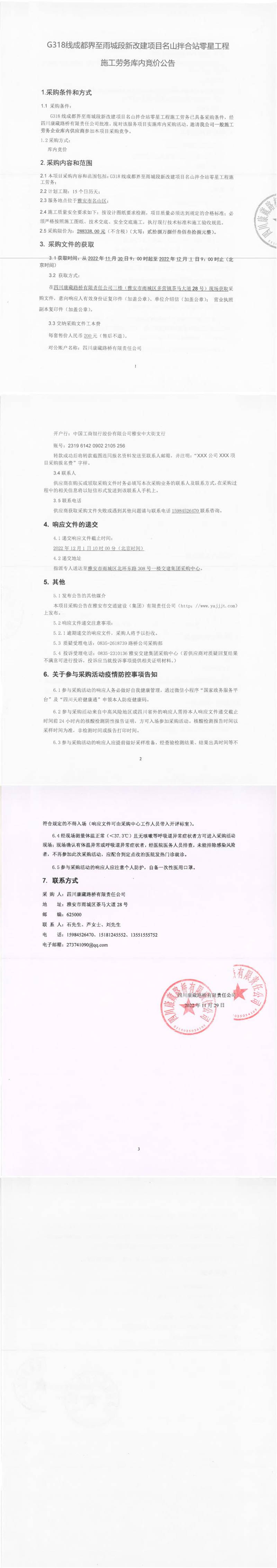 四川康藏路橋有限責任公司G318線成都界至雨城段新改建項目名山拌合站零星工程施工勞務庫內(nèi)競價公告