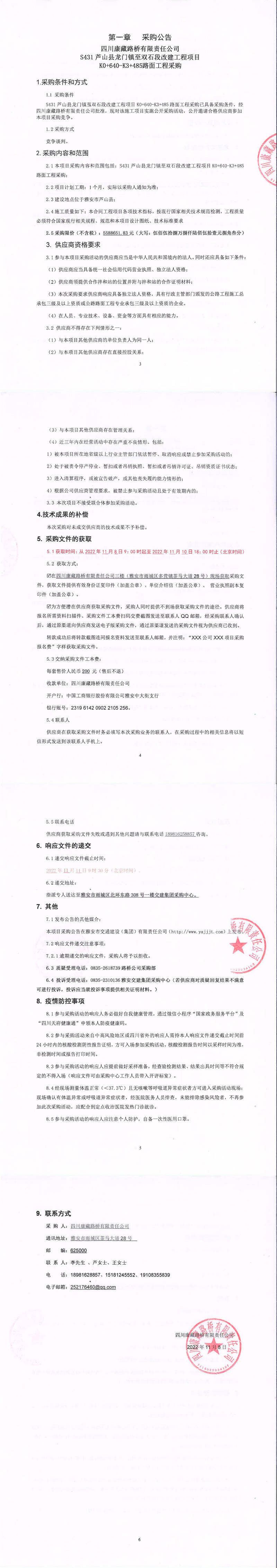 四川康藏路橋有限責(zé)任公司S431蘆山縣龍門鎮(zhèn)至雙石段改建工程項目K0+640-K3+485路面工程采購公告