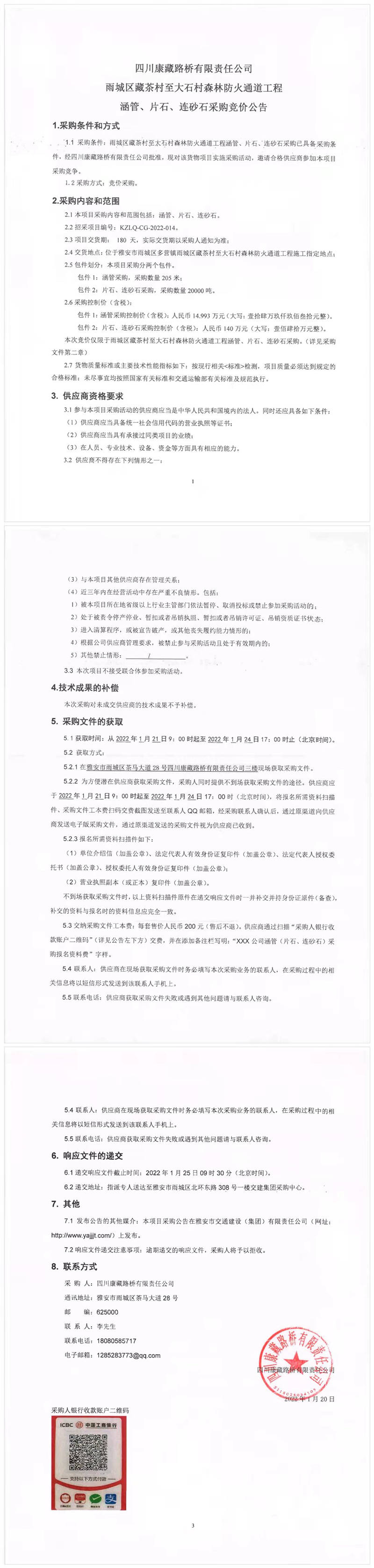 四川康藏路橋有限責(zé)任公司雨城區(qū)藏茶村至大石村森林防火通道工程涵管、片石、連砂石采購競(jìng)價(jià)公告