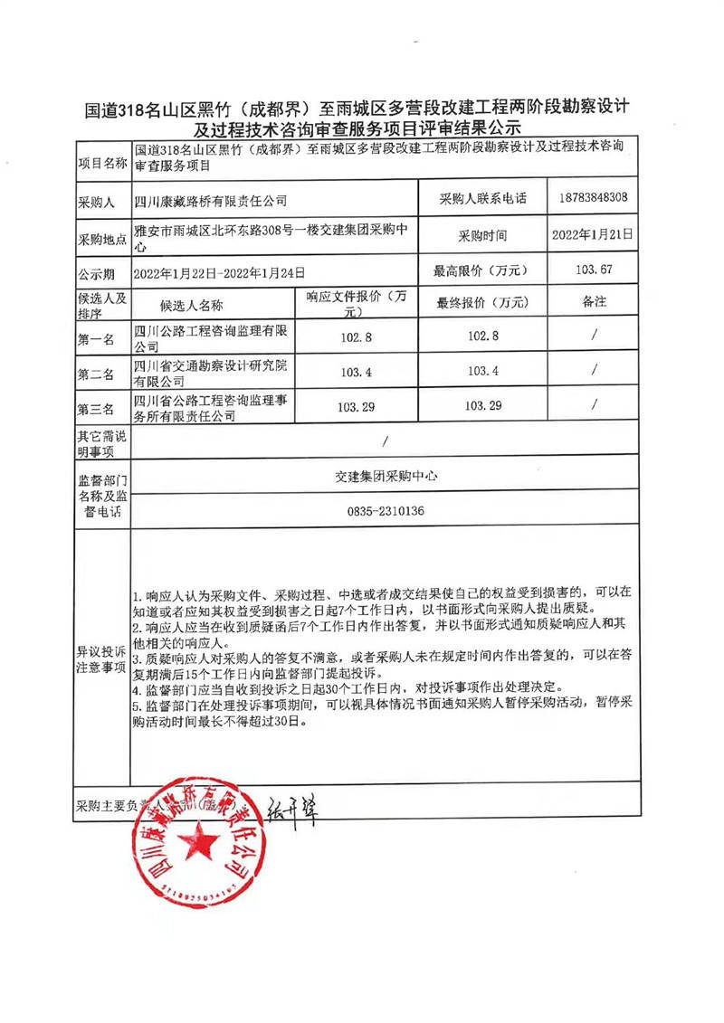四川康藏路橋有限責任公司國道318名山區(qū)黑竹(成都界)至雨城區(qū)多營段改建工程兩階段勘察設計及過程技術(shù)咨詢審查服務項目評審結(jié)果公示
