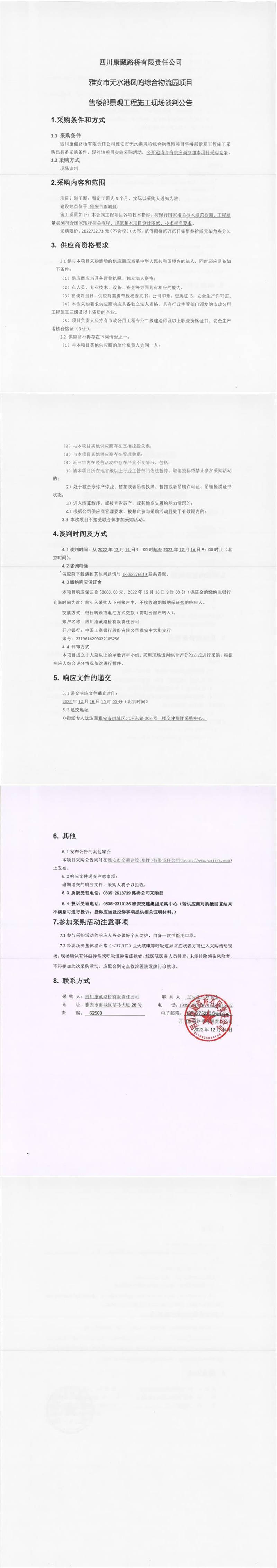 四川康藏路橋有限責任公司雅安市無水港鳳鳴綜合物流園項目售樓部景觀工程施工現(xiàn)場談判公告