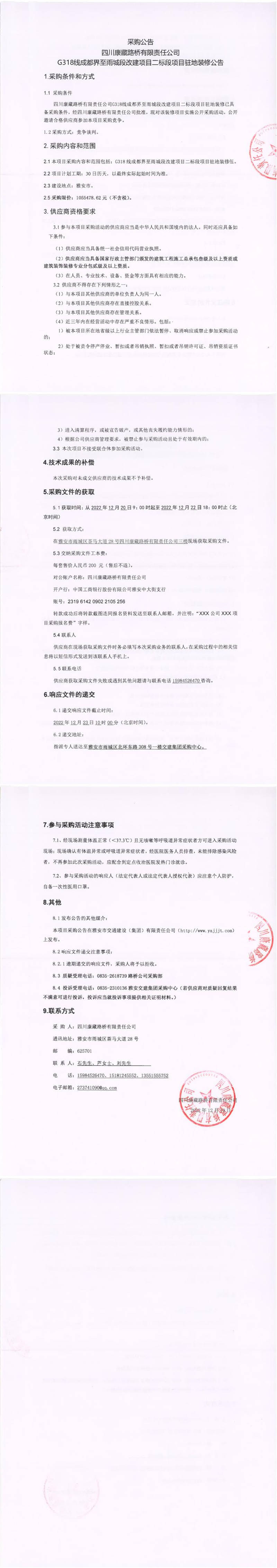 四川康藏路橋有限責任公司G318線成都界至雨城段改建項目二標段項目駐地裝修采購公告