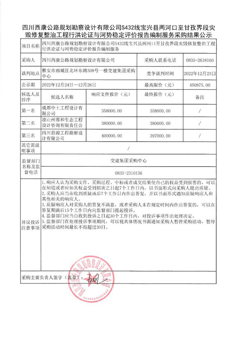 四川西康公路規(guī)劃勘察設(shè)計(jì)有限公司S432線寶興縣兩河口至甘孜界段災(zāi)毀修復(fù)整治工程行洪論證與河勢穩(wěn)定評價(jià)報(bào)告編制服務(wù)采購結(jié)果公示
