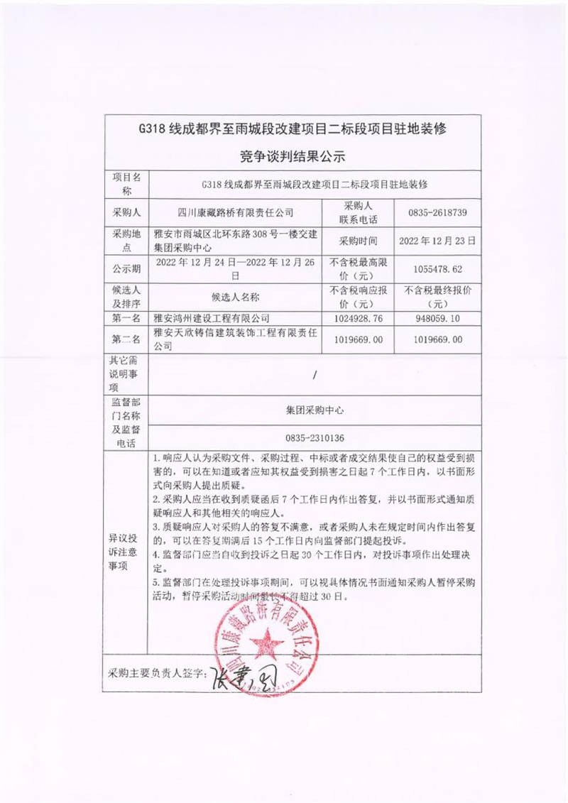 四川康藏路橋有限責(zé)任公司G318線成都界至雨城段改建項(xiàng)目二標(biāo)段項(xiàng)目駐地裝修競爭談判結(jié)果公示