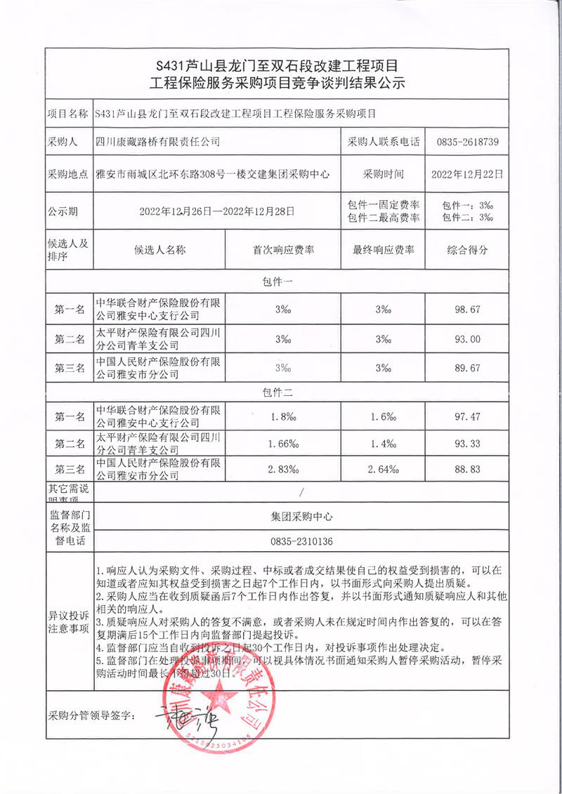 四川康藏路橋有限責(zé)任公司S431蘆山縣龍門至雙石段改建工程項(xiàng)目工程保險(xiǎn)服務(wù)采購項(xiàng)目競(jìng)爭(zhēng)談判結(jié)果公示