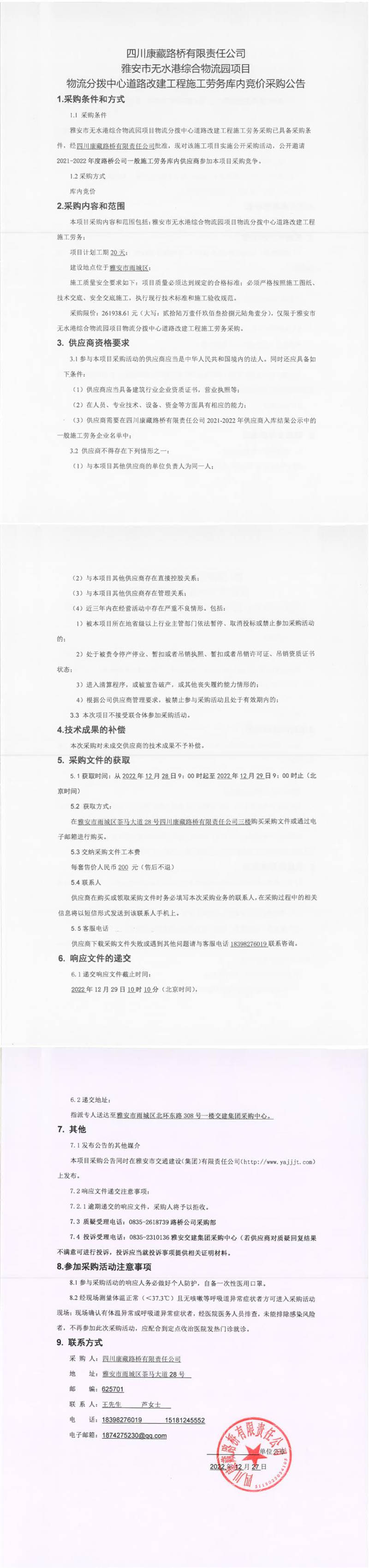 四川康藏路橋有限責任公司雅安市無水港綜合物流園項目物流分撥中心道路改建工程施工勞務(wù)庫內(nèi)競價采購公告