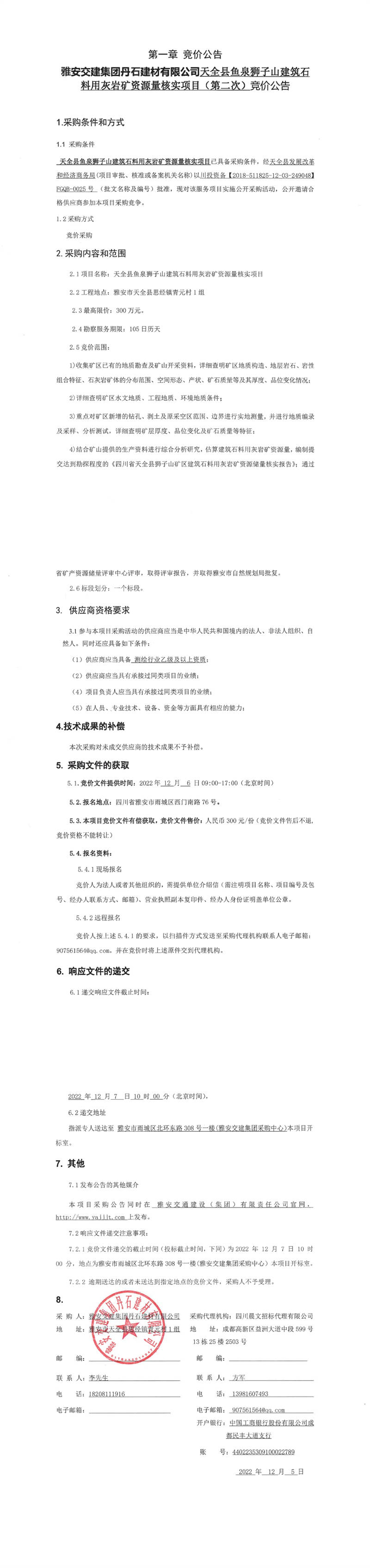 雅安交建集團丹石建材有限公司天全縣魚泉獅子山建筑石料用灰?guī)r礦資源量核實項目(第二次)競價公告