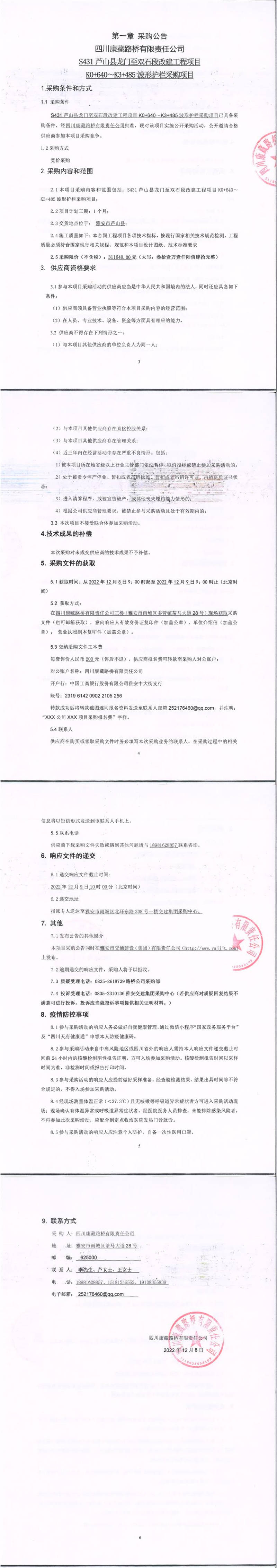 四川康藏路橋有限責(zé)任公司S431蘆山縣龍門鎮(zhèn)至雙石段改建工程項(xiàng)目K0+640-K3+485波形護(hù)欄采購項(xiàng)目采購公告