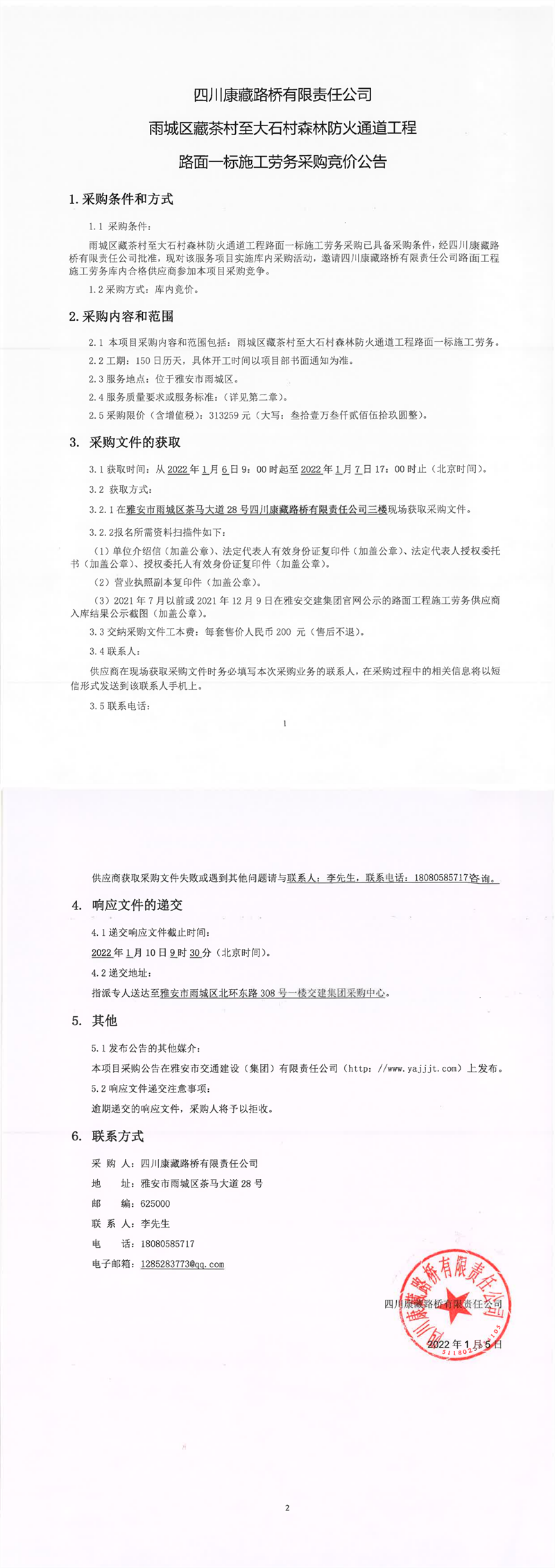 四川康藏路橋有限責(zé)任公司雨城區(qū)藏茶村至大石村森林防火通道工程路面一標(biāo)施工勞務(wù)采購競價(jià)公告