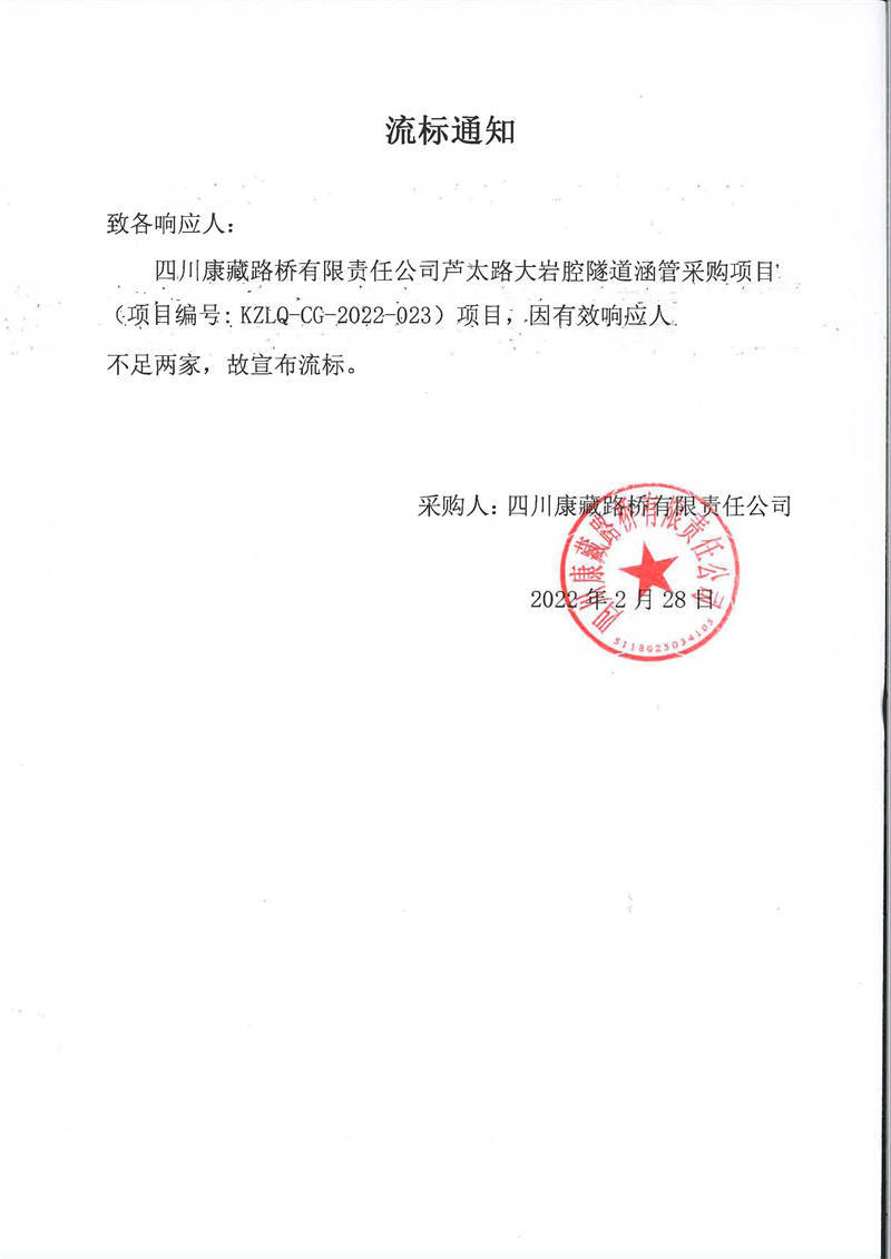 四川康藏路橋有限責(zé)任公司蘆太路大巖腔隧道涵管采購項目流標通知