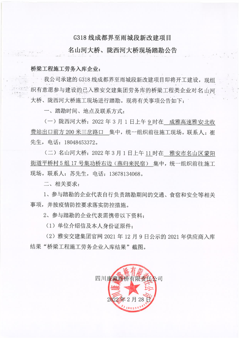 四川康藏路橋有限責任公司G318線成都界至雨城段新改建項目名山河大橋、隴西河大橋現(xiàn)場踏勘公告