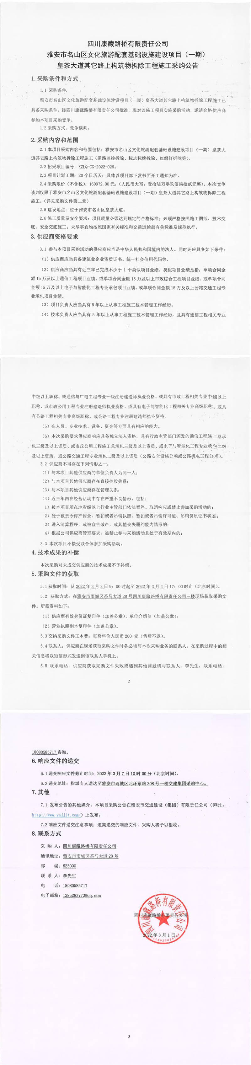 四川康藏路橋有限責(zé)任公司雅安市名山區(qū)文化旅游配套基礎(chǔ)設(shè)施建設(shè)項(xiàng)目(一期)皇茶大道其它路上構(gòu)筑物拆除工程施工采購(gòu)公告