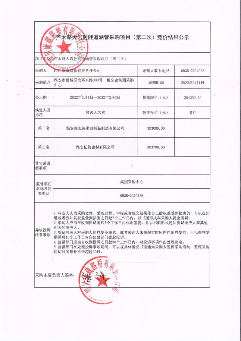 四川康藏路橋有限責(zé)任公司蘆太路大巖腔隧道涵管采購項目(第二次)競價結(jié)果公示