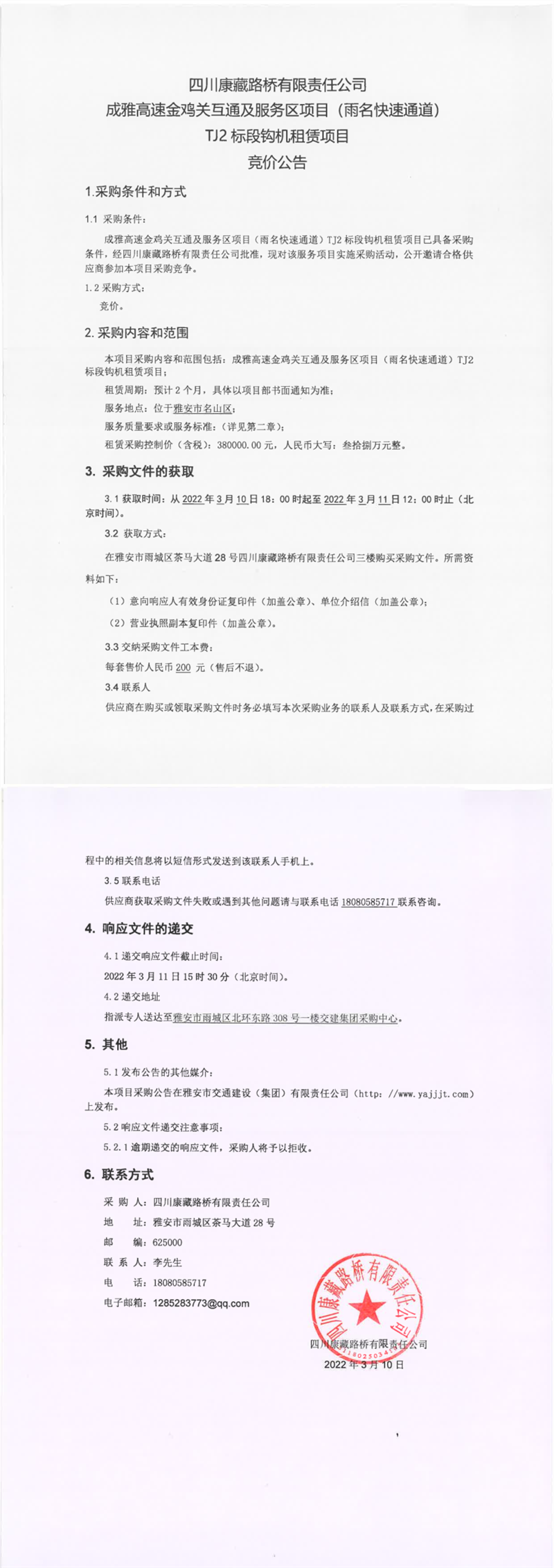 四川康藏路橋有限責(zé)任公司成雅高速金雞關(guān)互通及服務(wù)區(qū)項(xiàng)目(雨名快速通道)TJ2標(biāo)段鉤機(jī)租賃項(xiàng)目競(jìng)價(jià)公告