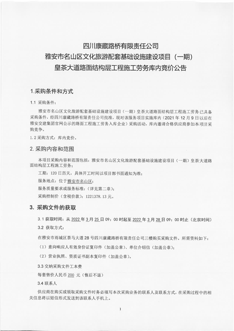 四川康藏路橋有限責任公司雅安市名山區(qū)文化旅游配套基礎設施建設項目(一期)皇茶大道路面結(jié)構(gòu)層工程施工勞務庫內(nèi)競價公告