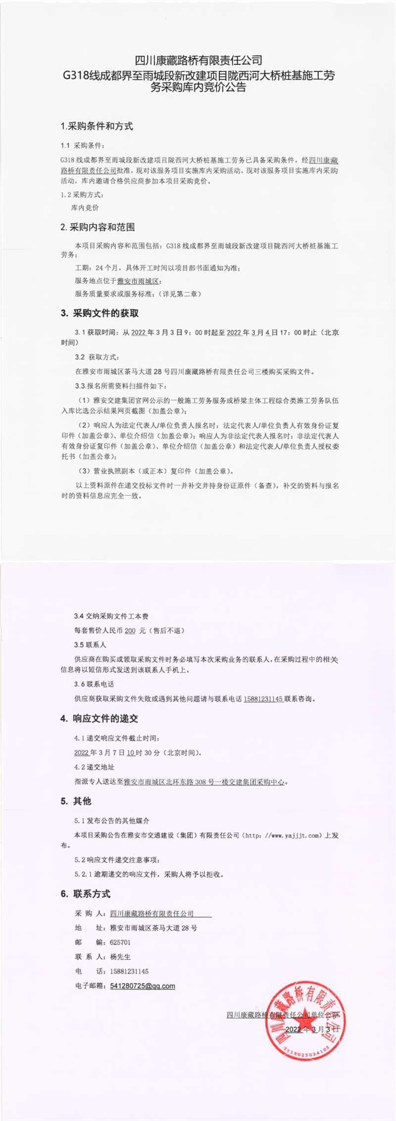 四川康藏路橋有限責(zé)任公司G318線成都界至雨城段新改建項目名山河大橋樁基施工勞務(wù)采購庫內(nèi)競價公告
