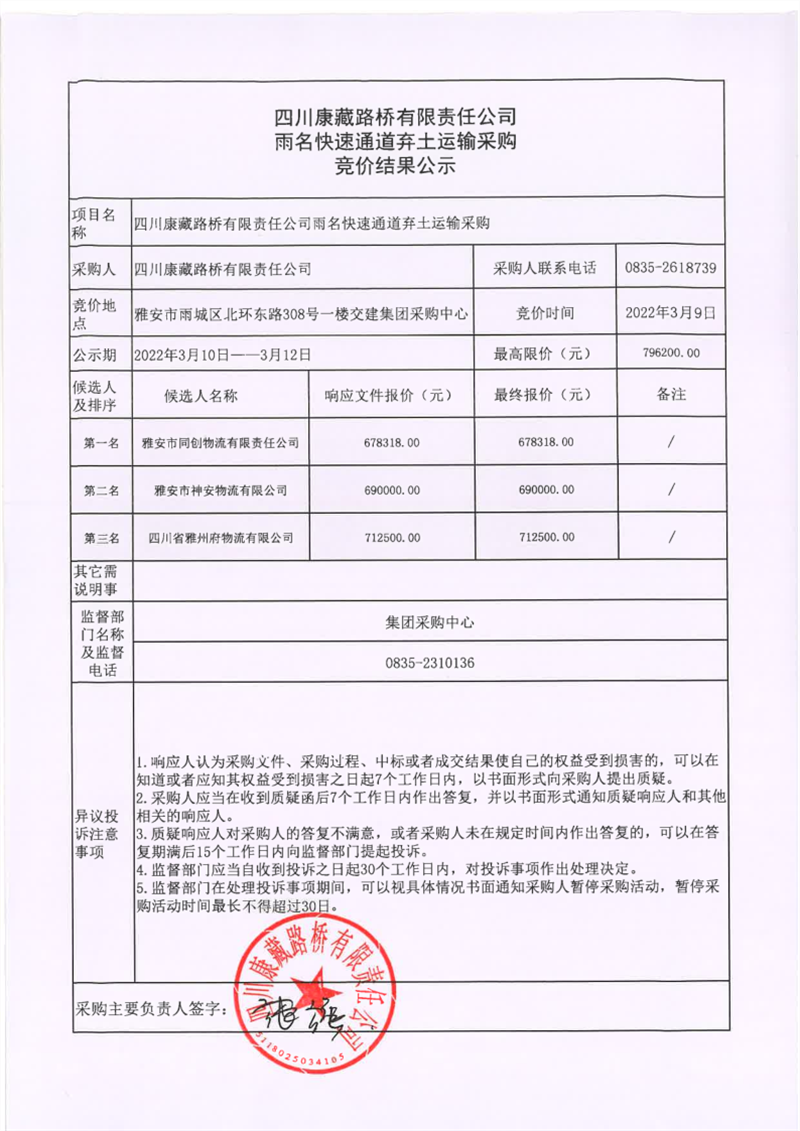 四川康藏路橋有限責(zé)任公司雨名快速通道棄土運(yùn)輸采購競(jìng)價(jià)結(jié)果公示