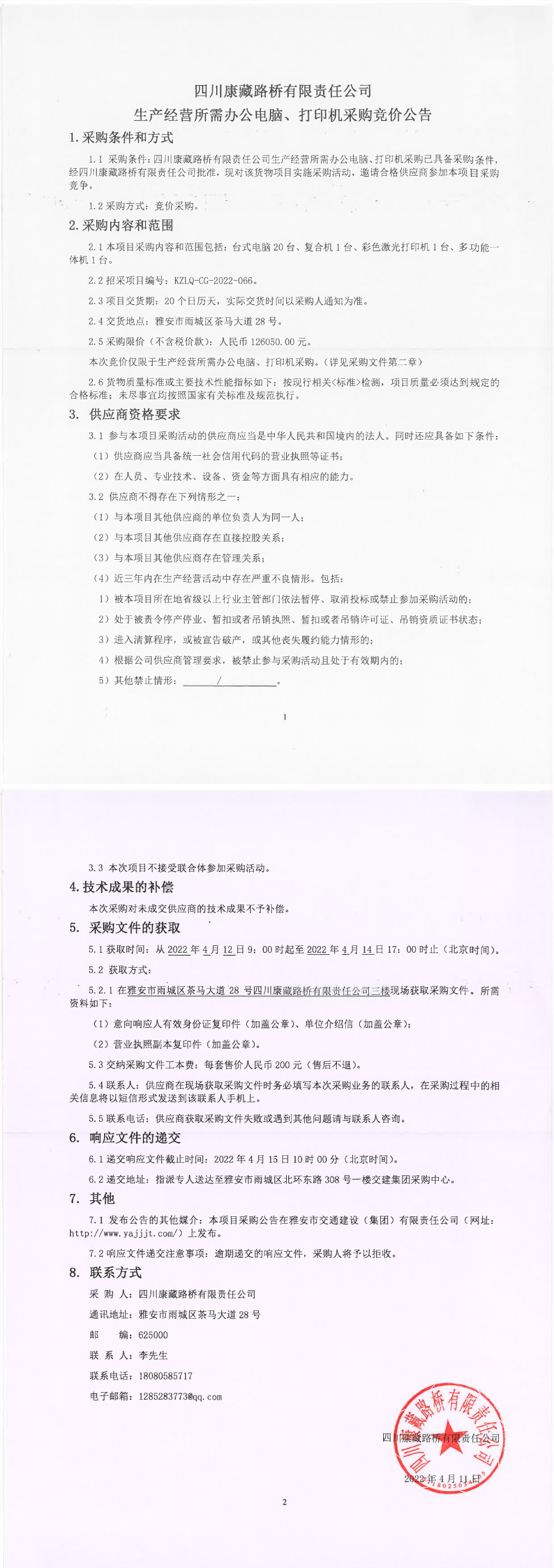 四川康藏路橋有限責(zé)任公司生產(chǎn)經(jīng)營所需辦公電腦、打印機(jī)采購競價(jià)公告