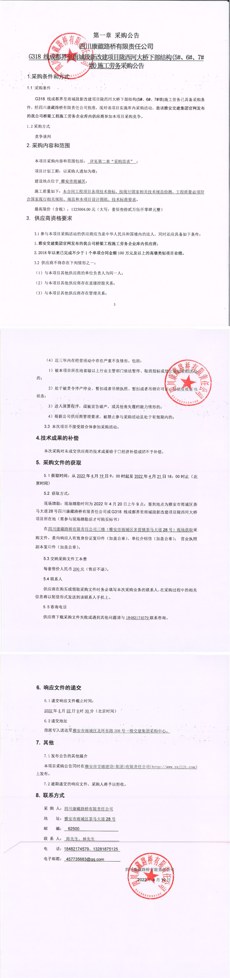 四川康藏路橋有限責任公司G318線成都界至雨城段新改建項目隴西河大橋下部結構(5#、6#、7#墩)施工勞務采購公告