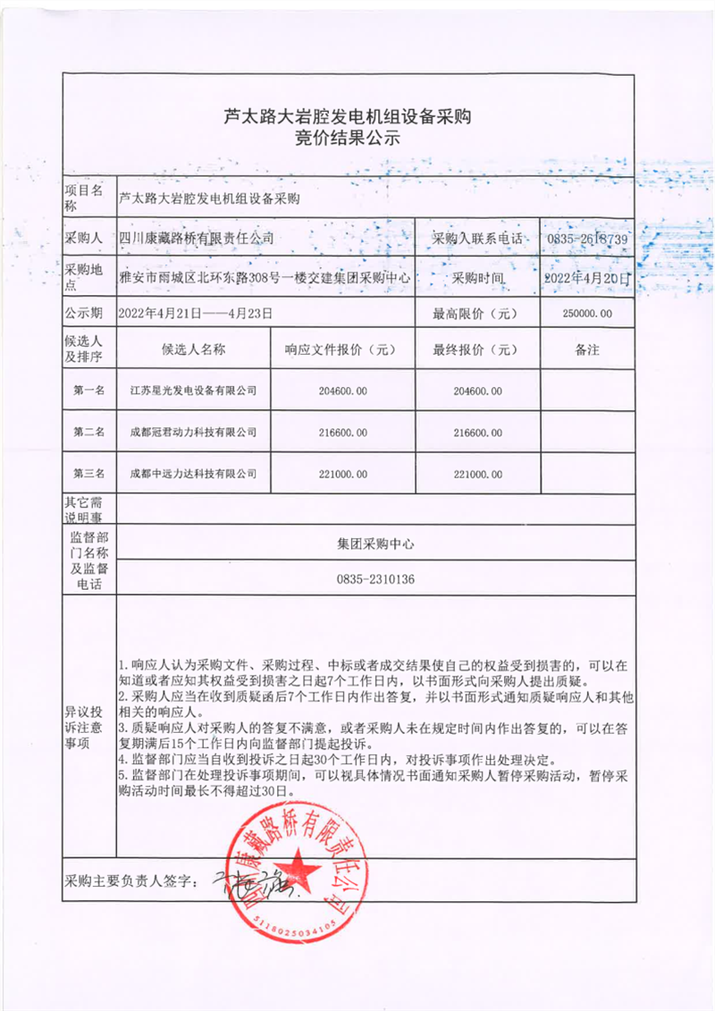 四川康藏路橋有限責任公司蘆太路大巖腔發(fā)電機組設(shè)備采購競價結(jié)果公示