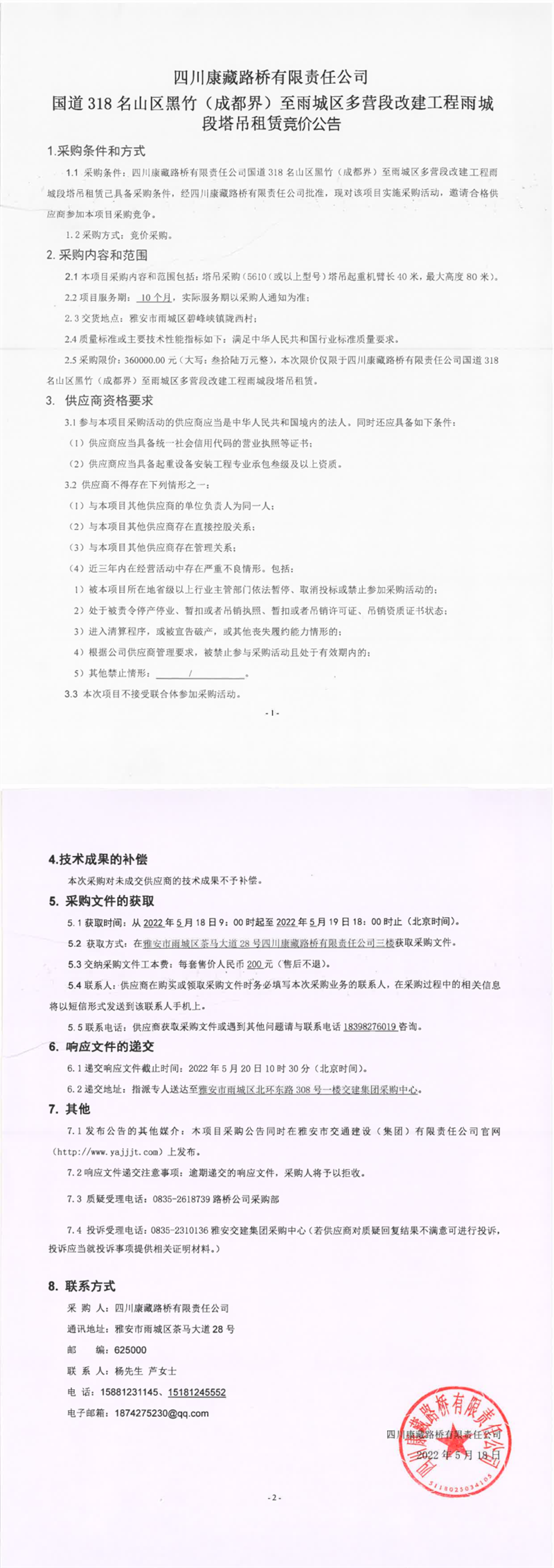 四川康藏路橋有限責(zé)任公司國道318名山區(qū)黑竹(成都界)至雨城區(qū)多營段改建工程雨城段塔吊租賃競價(jià)公告