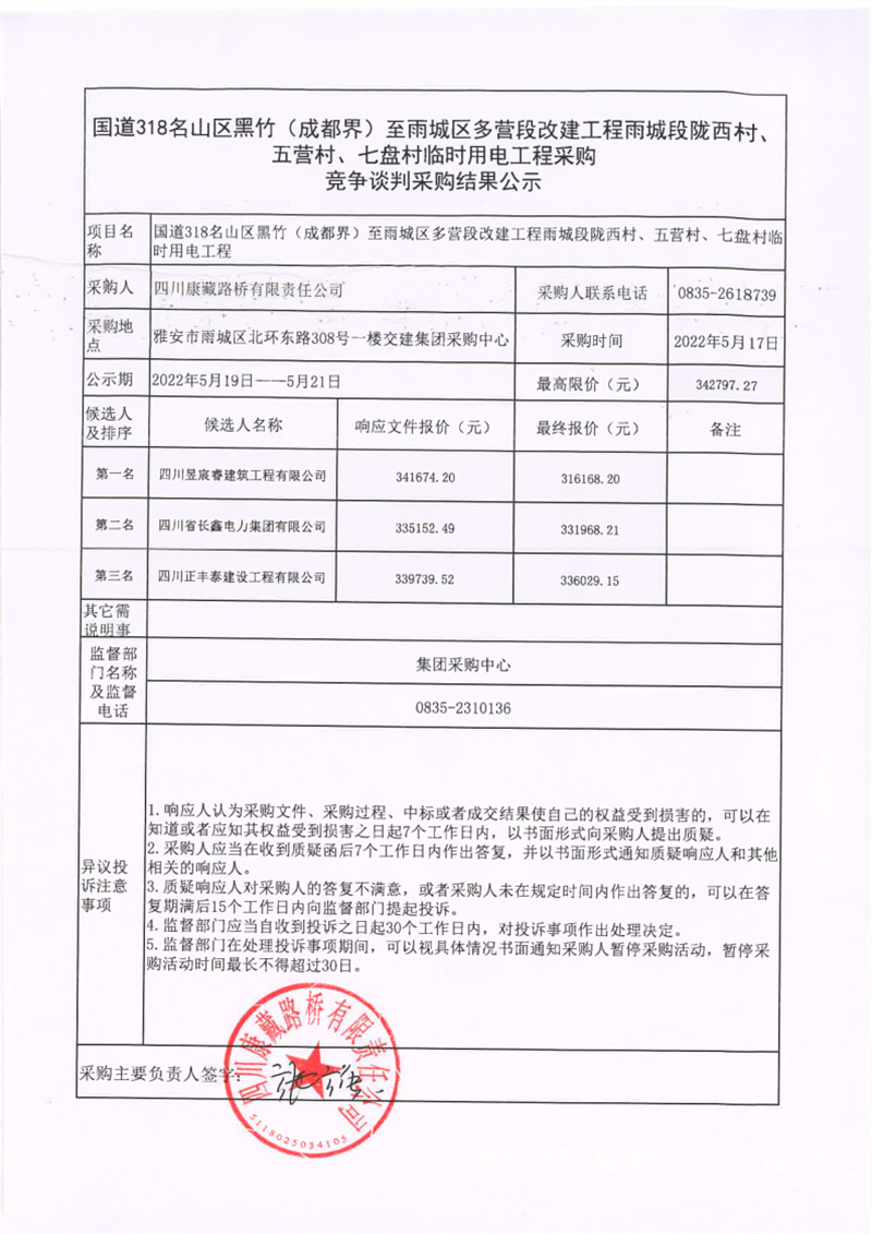 四川康藏路橋有限責(zé)任公司國(guó)道318名山區(qū)黑竹(成都界)至雨城區(qū)多營(yíng)段改建工程雨城段隴西村、五營(yíng)村、七盤村臨時(shí)用電工程采購競(jìng)爭(zhēng)談判結(jié)果公示