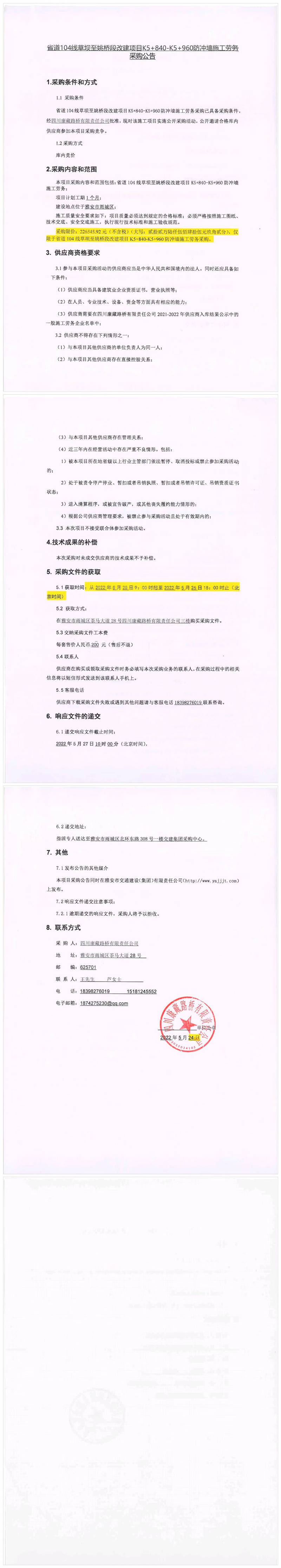 四川康藏路橋有限責任公司省道104線草壩至姚橋段改建項目K5+840-K5+960防沖墻施工勞務采購公告