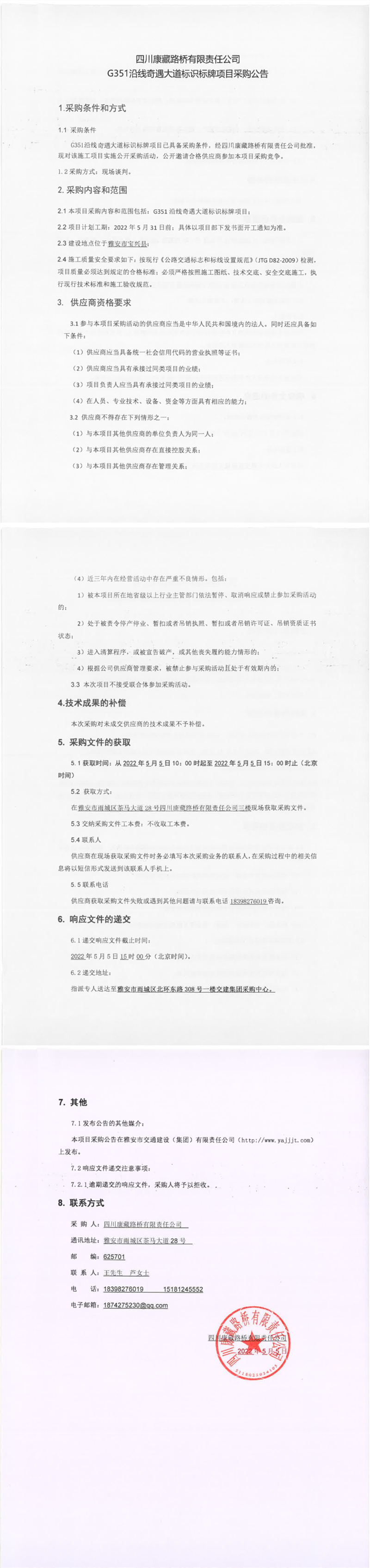 四川康藏路橋有限責(zé)任公司G351沿線奇遇大道標(biāo)識標(biāo)牌項目采購公告