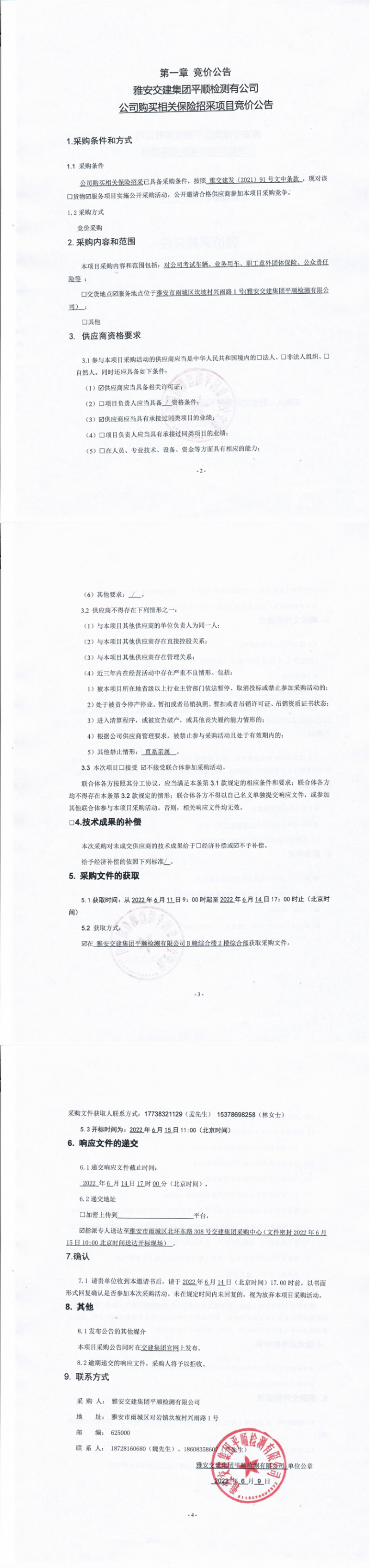 雅安交建集團(tuán)平順檢測(cè)有限公司公司購(gòu)買相關(guān)保險(xiǎn)招采項(xiàng)目競(jìng)價(jià)公告