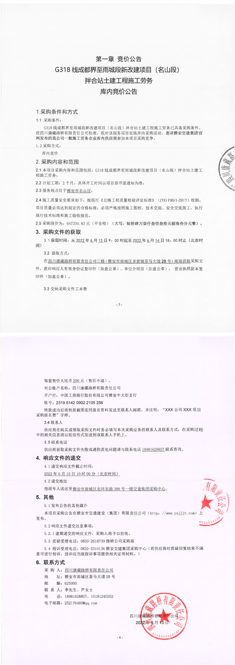 四川康藏路橋有限責(zé)任公司G318線成都界至雨城段新改建項目(名山段)拌合站土建工程施工勞務(wù)庫內(nèi)競價公告