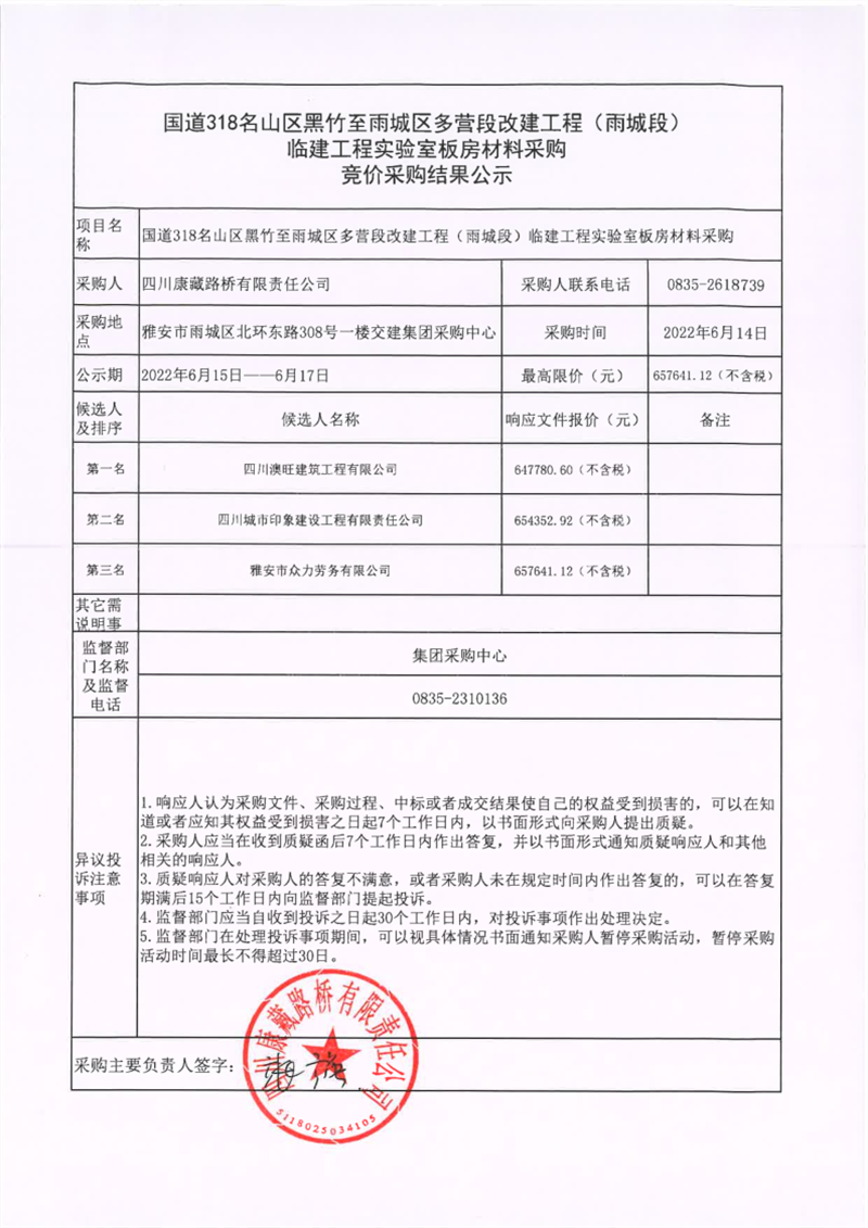四川康藏路橋有限責任公司國道318名山區(qū)黑竹至雨城區(qū)多營段改建工程(雨城段)臨建工程實驗室板房材料采購競價采購結果公示