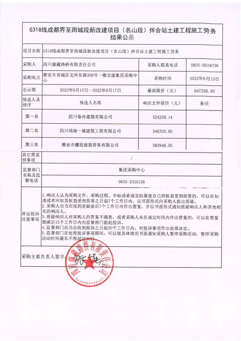四川康藏路橋有限責任公司G318線成都界至雨城段新改建項目(名山段)拌合站土建工程施工勞務結(jié)果公示