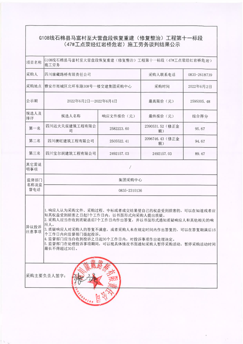 四川康藏路橋有限責(zé)任公司G108線石棉縣馬富村至大營盤段恢復(fù)重建(修復(fù)整治)工程第十一標段(47#工點滎經(jīng)紅巖橋危巖)施工勞務(wù)談判結(jié)果公示
