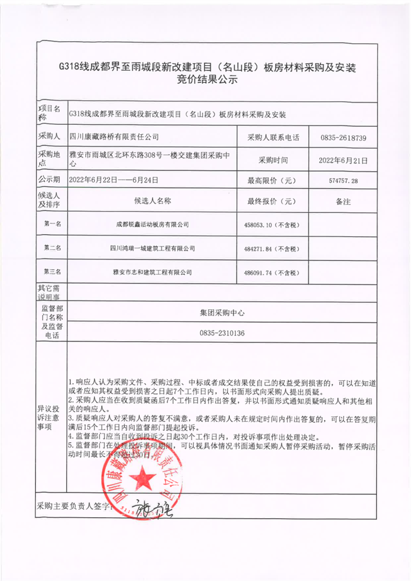 四川康藏路橋有限責任公司G318線成都界至雨城段新改建項目(名山段)板房材料采購及安裝競價結果公示