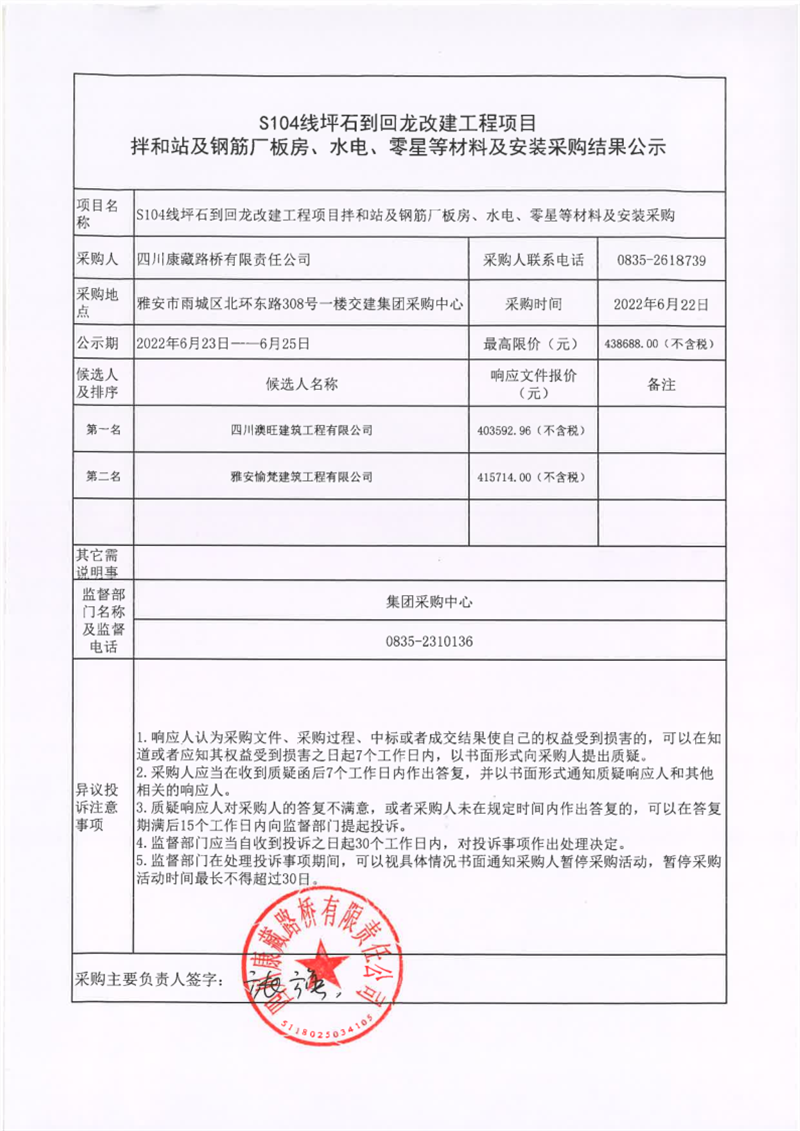 四川康藏路橋有限責(zé)任公司S104線坪石到回龍改建工程項(xiàng)目拌和站及鋼筋廠板房、水電、零星等材料及安裝采購(gòu)結(jié)果公示