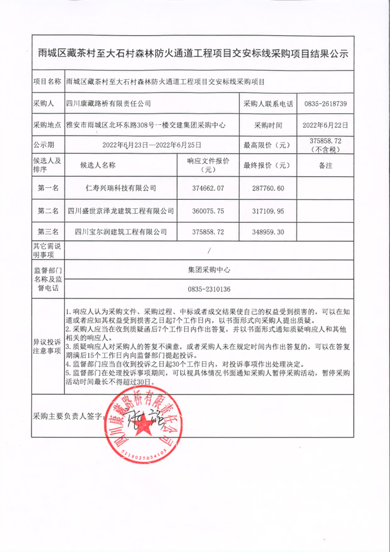 四川康藏路橋有限責(zé)任公司雨城區(qū)藏茶村至大石村森林防火通道工程項(xiàng)目交安標(biāo)線采購(gòu)項(xiàng)目結(jié)果公示