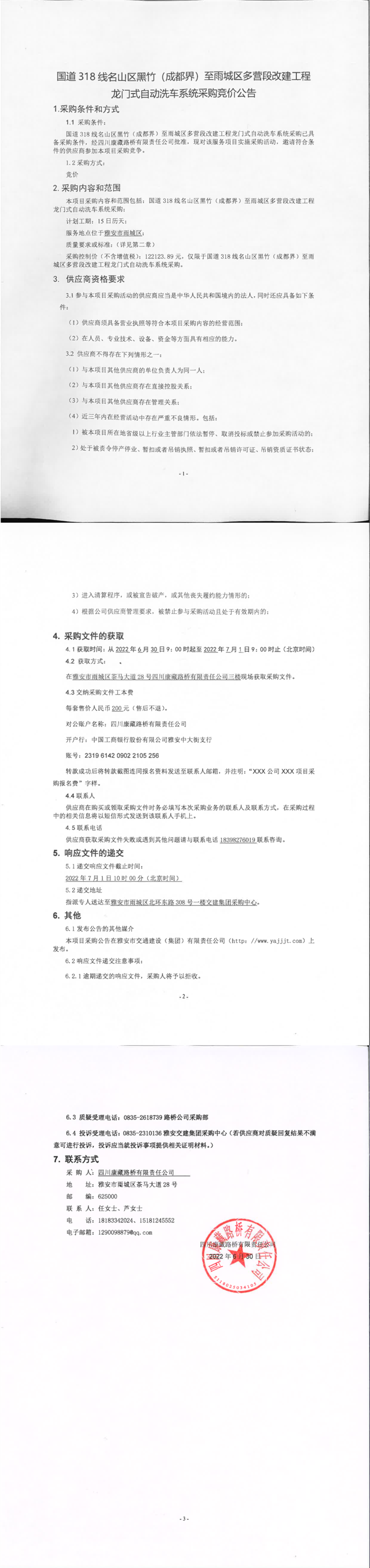 四川康藏路橋有限責(zé)任公司國道318名山區(qū)黑竹(成都界)至雨城區(qū)多營段改建工程龍門式自動洗車系統(tǒng)采購競價公告