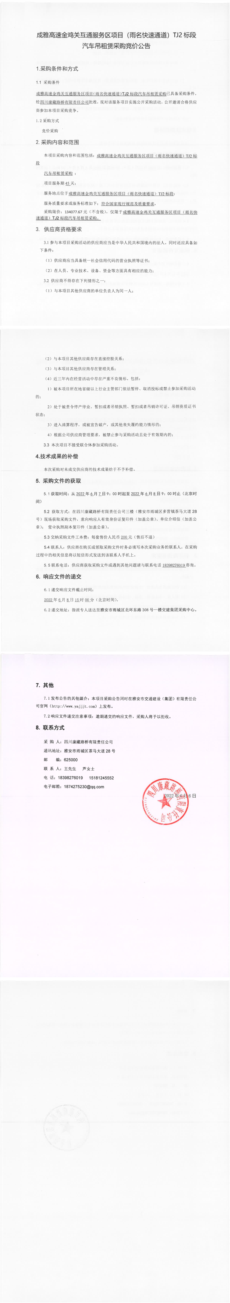 四川康藏路橋有限責(zé)任公司成雅高速金雞關(guān)互通服務(wù)區(qū)項(xiàng)目(雨名快速通道)TJ2標(biāo)段汽車吊租賃采購競價(jià)公告